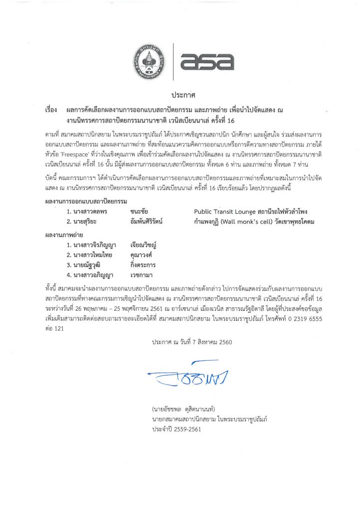 Home » News » ประกาศผลการคัดเลือกผลงานการออกแบบสถาปัตยกรรมและภาพถ่าย เพื่อจัดแสดง ณ งานนิทรรศการสถาปัตยกรรมนานาชาติ เวนิสเบียนนาเล่ ครั้งที่ 16